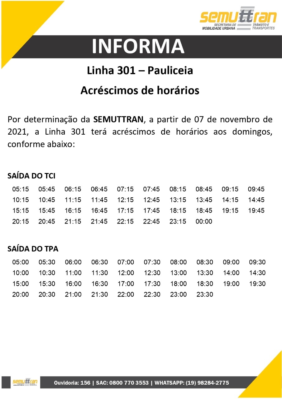 A mudança maior será feita na linha 301, que passará a ter acréscimo de horários, aos domingos. A medida entra em vigor a partir deste domingo, 7/11.