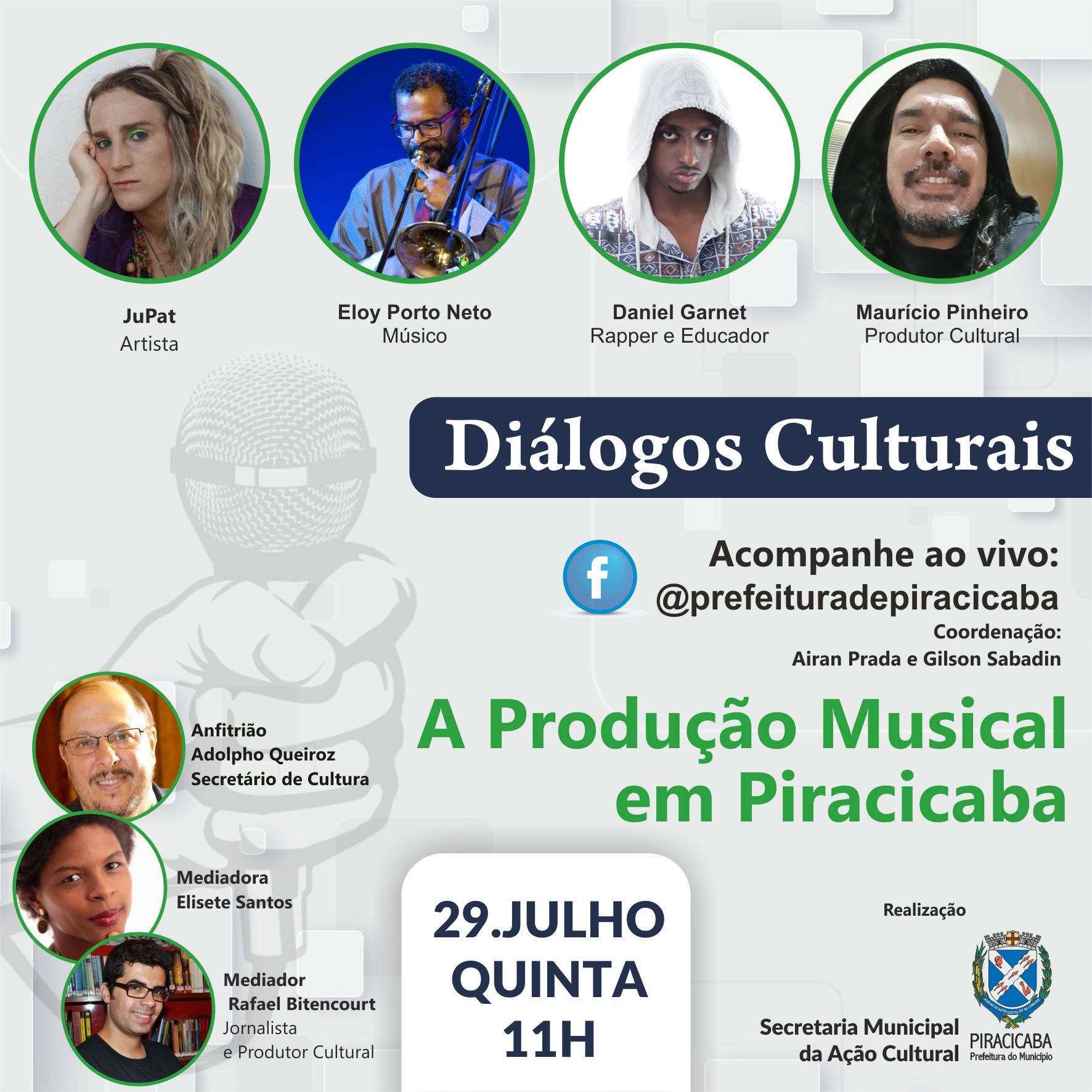 A Secretaria Municipal de Ação Cultural (Semac) promove nesta quinta-feira, 29/07, às 11h, a live Diálogos Culturais: A Produção Musical em Piracicaba, que visa discutir políticas públicas voltadas à área da criação sonora. Serão abordados ainda temas como os obstáculos oriundos da pandemia da Covid-19, as produções musicais em nossa cidade e os diálogos que podem ser estabelecidos entre os fazedores de cultura e o Poder Público.