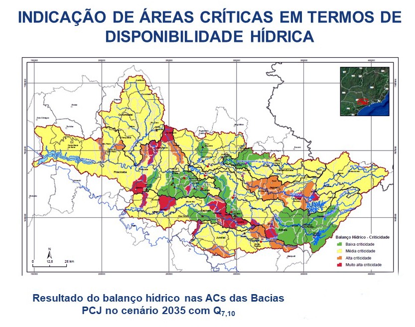 Instrumento de gestão previsto pela Política Nacional de Recursos Hídricos e pela Política Estadual de Recursos Hídricos do Estado de São Paulo, o Plano das Bacias PCJ 2020 a 2035 foi fundamentado em estudos que traçaram um diagnóstico e analisaram as tendências para os próximos 15 anos nos 76 municípios das Bacias Piracicaba, Capivari e Jundiaí. Foram simulados cenários futuros de disponibilidade de água, que indicam como pontos de criticidade alta (mapa anexo), sendo que entre as alternativas para ampliar a oferta de água para estas áreas estão, controle de perdas de água nas redes de distribuição, conservação, recuperação de nascentes e matas ciliares, saneamento rural e outras ações.