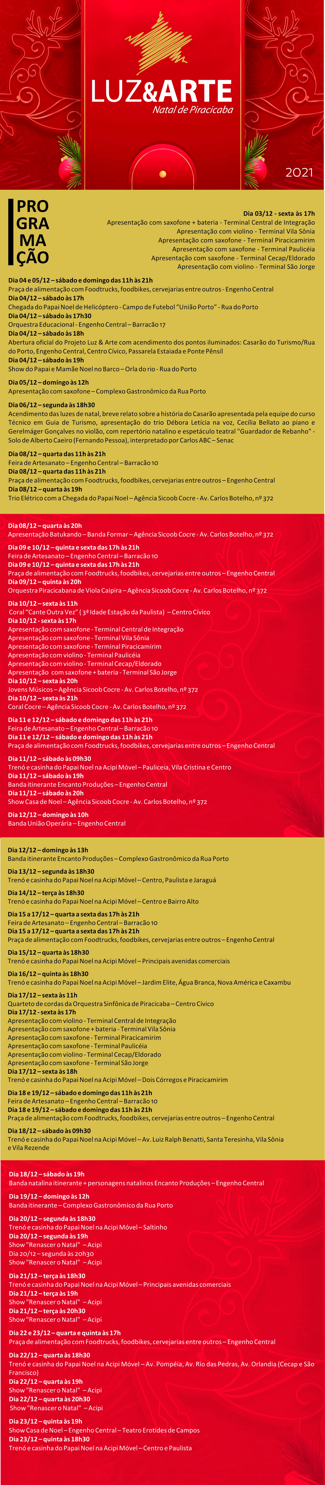 A programação do projeto Luz & Arte oferece atrações especiais para o feriado de quarta-feira, 08/12, Dia da Imaculada Conceição, com feira de artesanato, cervejarias e food trucks, no Engenho Central, a partir das 11h, além de show com Papai Noel e apresentação musical da Banda Formar na agência Sicoob Cocre, localizada na avenida Carlos Botelho, a partir das 19h. O Luz & Arte segue até 23/12 e é realizado pela Prefeitura e Acipi (Associação Comercial e Industrial de Piracicaba), com o objetivo de oferecer atrações culturais gratuitas à população, incentivar o turismo no município e fomentar as vendas de Natal do comércio local.