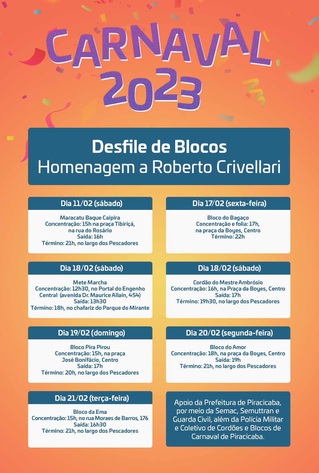 APOIO – O desfile dos blocos carnavalescos de Piracicaba em 2023 tem apoio da Prefeitura de Piracicaba, por meio da Semac (Secretaria Municipal da Ação Cultural), com o fornecimento de banheiros químicos posicionados em vias públicas por onde passarão os foliões. Tem, também, apoio do Coletivo de Cordões e Blocos de Carnaval de Piracicaba.
