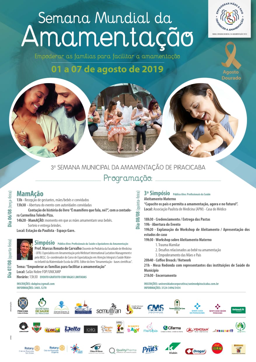 No dia 08 de agosto, às 19 horas, acontecerá ainda, na Associação Paulista de Medicina (APM – Casa do Médico), um simpósio organizado pela Unimed Piracicaba, direcionado a profissionais da saúde, para discussão de protocolos de manejo do aleitamento materno, com inscrições pelo e-mail: universidadecorporativa@unimed.com.br.
