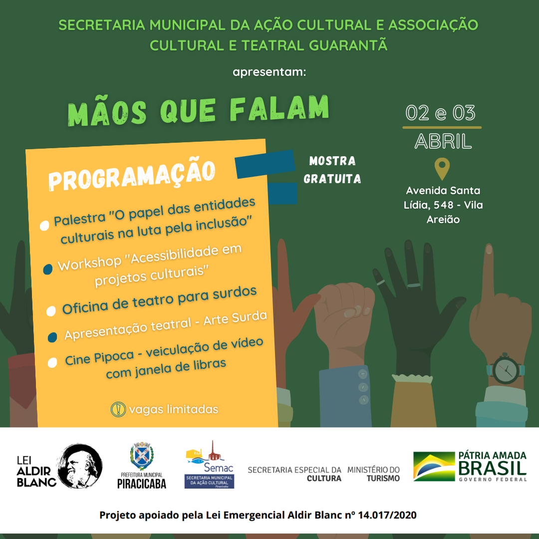 Com o objetivo de trazer para Piracicaba arte para a comunidade surda, a mostra Mãos que Falam conta com diversas atividades gratuitas, que serão realizadas nos dias 02 e 03/04, na Associação Cultural e Teatral Guarantã. O projeto foi contemplado em Edital da Secretaria Municipal da Ação Cultural, por meio da Lei Aldir Blanc.