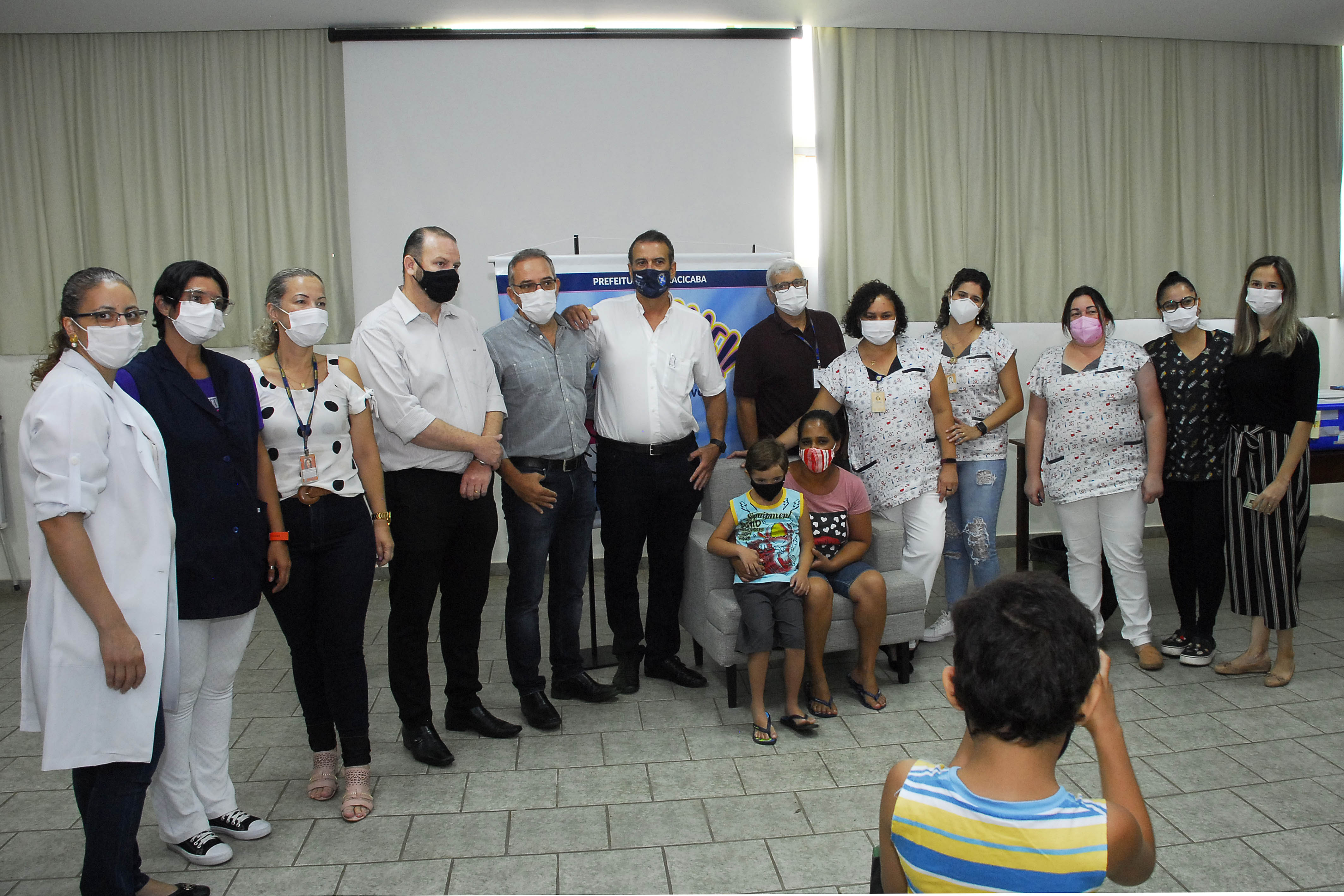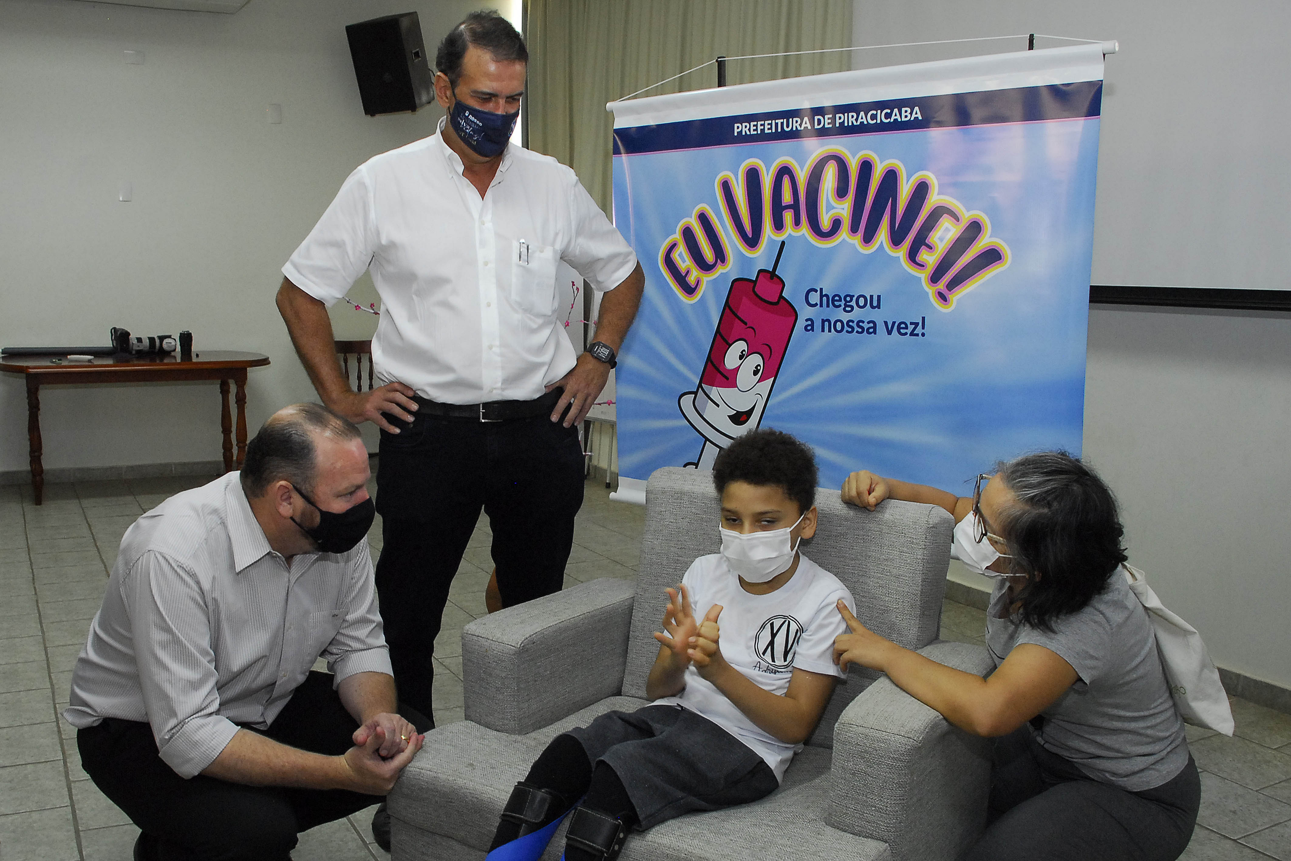 Faltando dois dias para completar um ano do início da vacinação contra Covid-19 em Piracicaba, hoje, quarta-feira, 19/01, o menino Adryan Samuel Maia Ponciano da Silva, 10 anos, foi a primeira criança a ser vacinada contra a doença no município. Esta nova etapa da vacinação teve início nesta manhã em cerimônia simbólica no Centro de Reabilitação Piracicaba (CRP), onde Adryan faz acompanhamento desde quando era bebê, devido à paralisia cerebral. A vacinação regular de crianças de cinco a 11 anos com deficiência permanente ou comorbidades, indígenas e quilombolas, por meio de agendamento, também tem início nesta tarde, nas unidades de saúde.