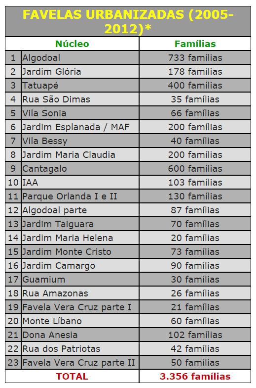 E foi assim que o prefeito Barjas Negri começou a sua fala para os beneficiários da regularização fundiária, que inclui 12 lotes na rua Maria de Lourdes Stolf, 19 na rua Santo Trevisan, seis na rua Corcovado, nove na Euclides Figueiredo e 12 na rua Dumit Antonio. "A noite de hoje é uma noite de alegria porque, enfim, após 30 anos, vocês conquistam o direito aos terrenos em que construíram suas casas". Barjas também afirmou que este tipo de trabalho, de melhorar a qualidade de vida das pessoas, lhes oportunizando uma cidade, um bairro, permearam suas duas primeiras gestões. Barjas frisou que, de 2005 a 2012, foram urbanizadas 23 favelas, beneficiando 3.356 famílias (veja a lista abaixo).