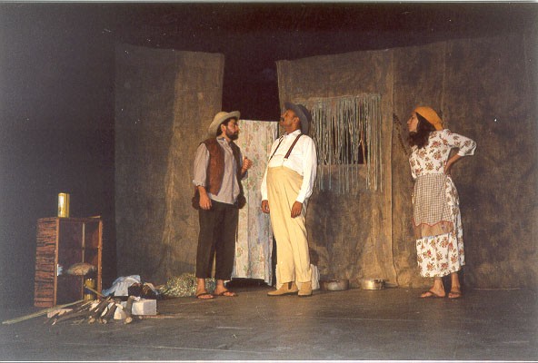 A cenografia estilizada é feita com panos, cordas e outros materiais que lembram a paisagem da seca nordestina, com fácil e rápida montagem.