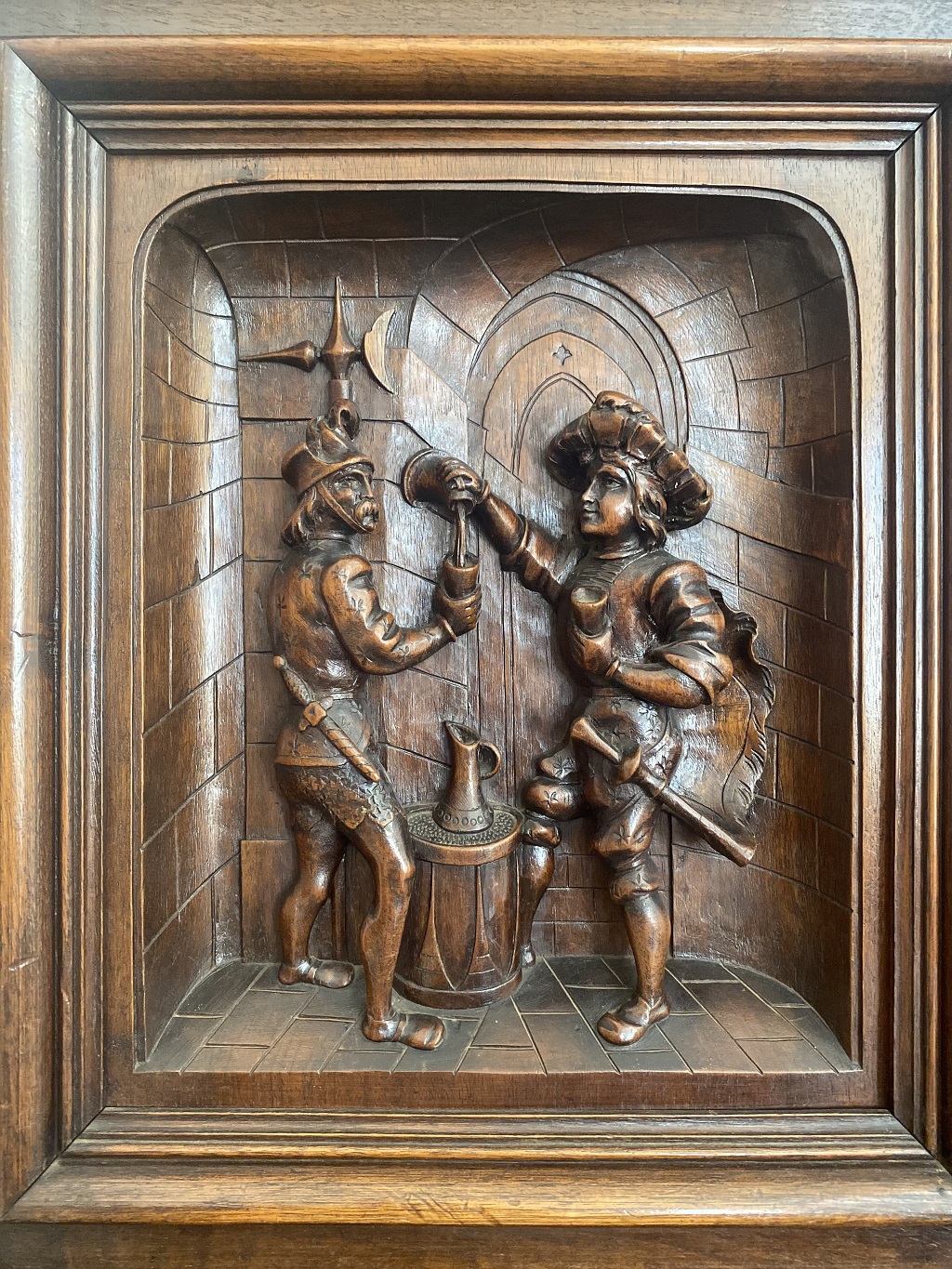 Detalhe de homens bebendo vinho, talhado na aparador doador | Foto: Erick Tedesco