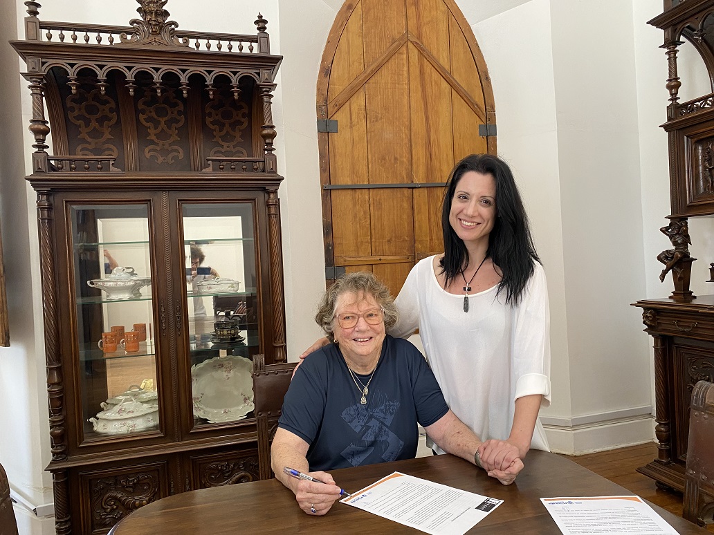 Françoise Balbaud Ometto assina termo de doação ao lado da conservadora de acervos, Ana Torrejais | Foto: Erick Tedesco
