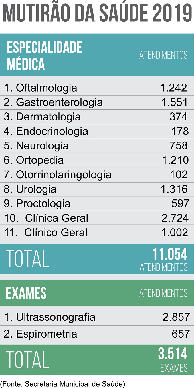 A Prefeitura de Piracicaba, por meio da Secretaria Municipal de Saúde, realizou 14.568 atendimentos no ano passado durante os Mutirões de Saúde. Foram 12 mutirões – um por mês – ao longo de 2019 e o montante corresponde a consultas com especialistas e exames médicos (veja tabela abaixo). Em 2018 foram 7.110 pessoas atendidas. Logo, em 2019, o dobro de pessoas foram beneficiadas pela iniciativa.