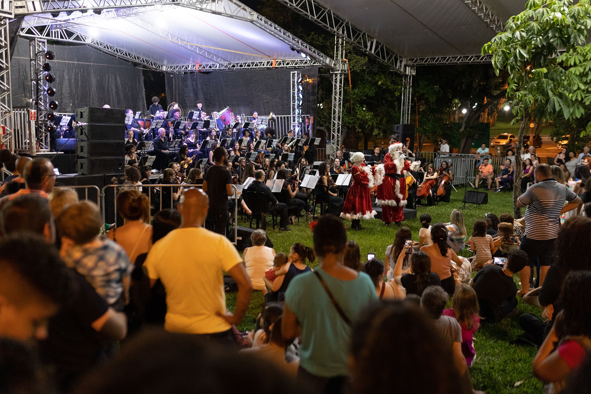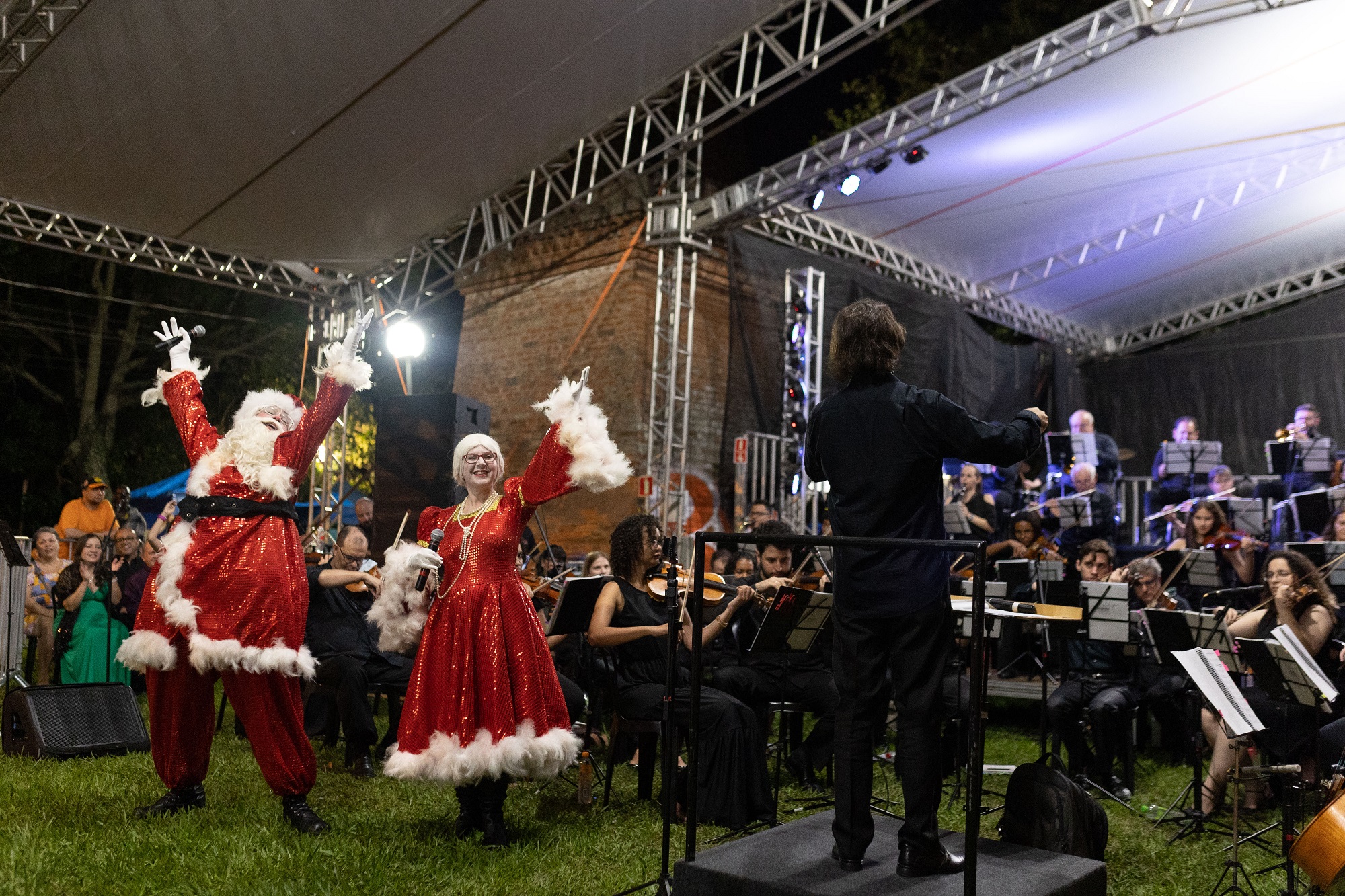 Papai e Mamãe Noel animaram o público junto da Orquestra Educacional de Piracicaba ao lado do Casarão do Turismo