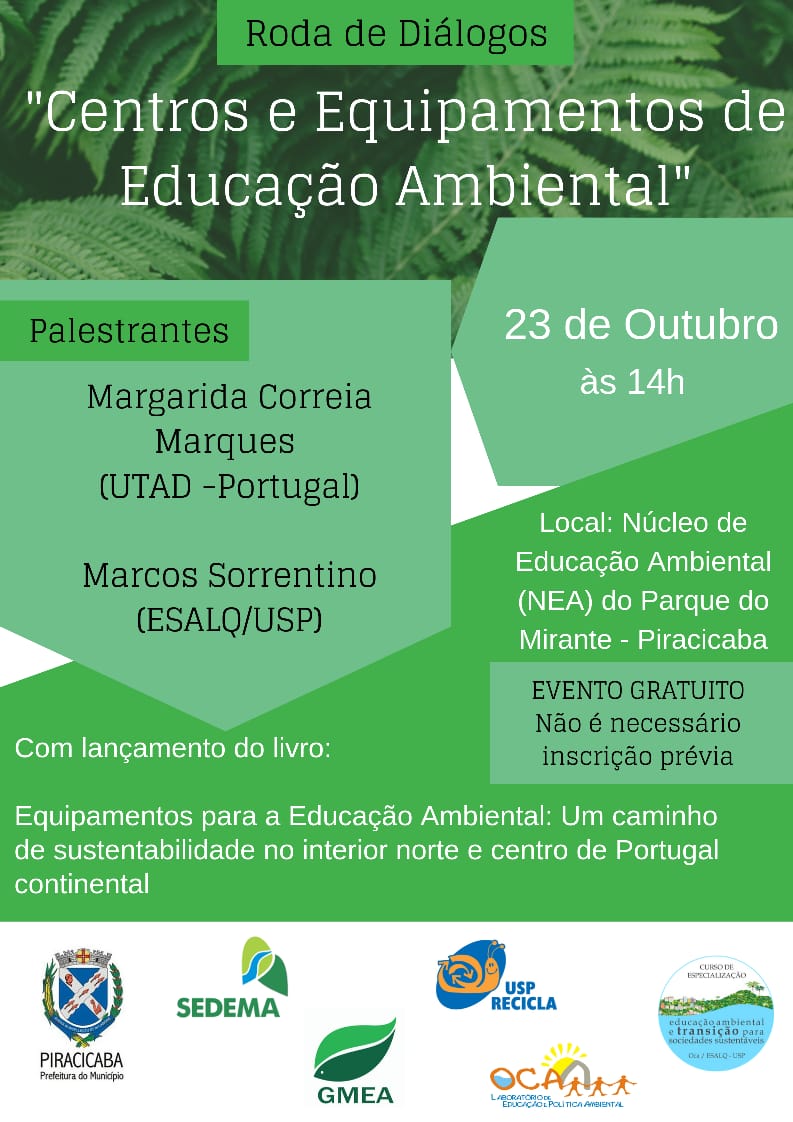 de Portugal Continental” de autoria da Profa. Dra. Margarida Correia Marques da Universidade de Trás-os-Montes e Alto Douro (UTAD), Vila Real, Portugal e coautoria do Prof. Marcos Sorrentino (USP/Piracicaba), seguida de uma roda de diálogo sobre Centros e Equipamentos de Educação Ambiental.