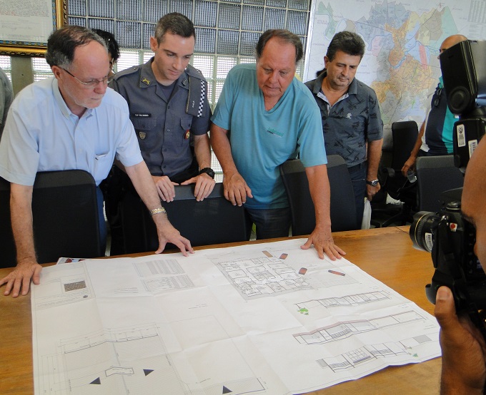 O prefeito Barjas Negri, capitão Saulo Vieira Runho e o vereador José Longatto olham projeto da nova sede da 5ª Cia