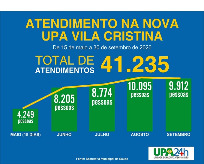 Na média, de maio a setembro houve um crescimento de 7% na procura por atendimentos médicos e de enfermagem na nova UPA Vila Cristina. Em 15 dias de funcionamento, maio contabilizou 4.249 pessoas recepcionadas; em junho foram 8.205; em julho, 8.774; em agosto, 10.095 e em setembro, 9.912. A queda registrada em setembro ante o mês de agosto está diretamente relacionada à reabertura da UPA Vila Rezende.