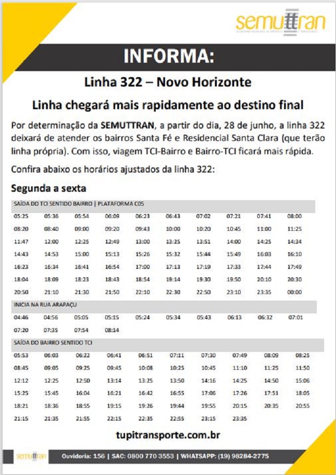 Os bairros Santa Fé e Residencial Santa Clara terão linhas próprias e, por isso, deixarão de ser atendidos pela linha 322. Com isso, a viagem TCI-bairro e bairro-TCI ficará mais rápida.