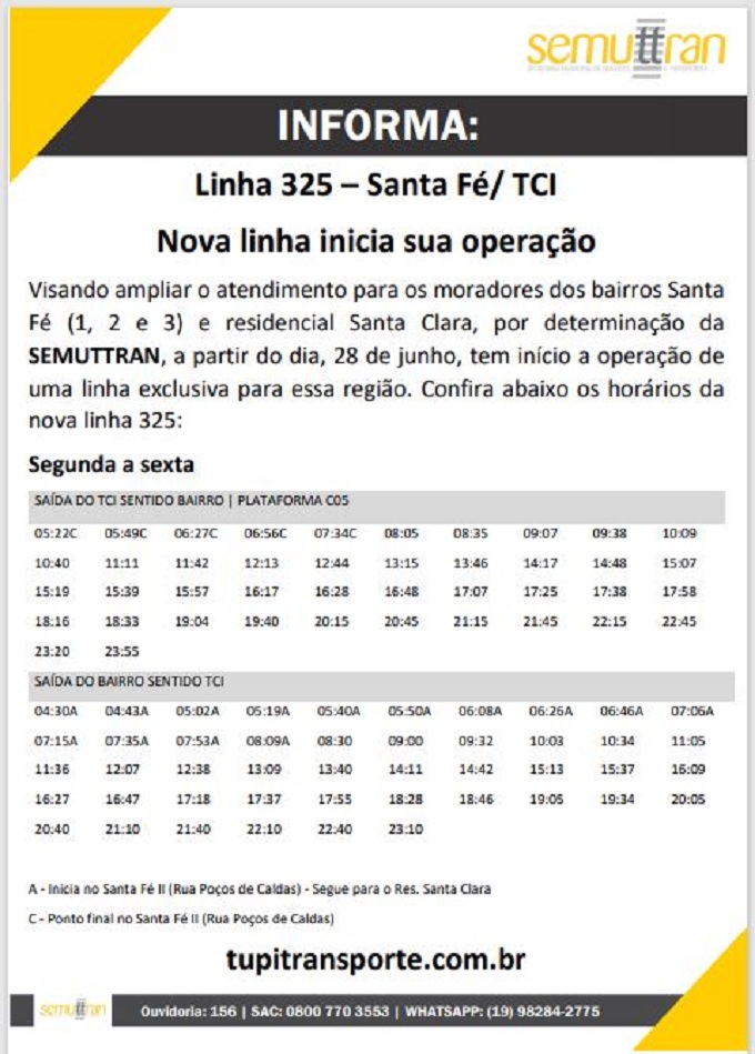 Já a linha 325-Santa Fé/TCI ampliará exclusivamente o atendimento para os moradores dos bairros Santa Fé (1, 2 e 3) e Residencial Santa Clara.