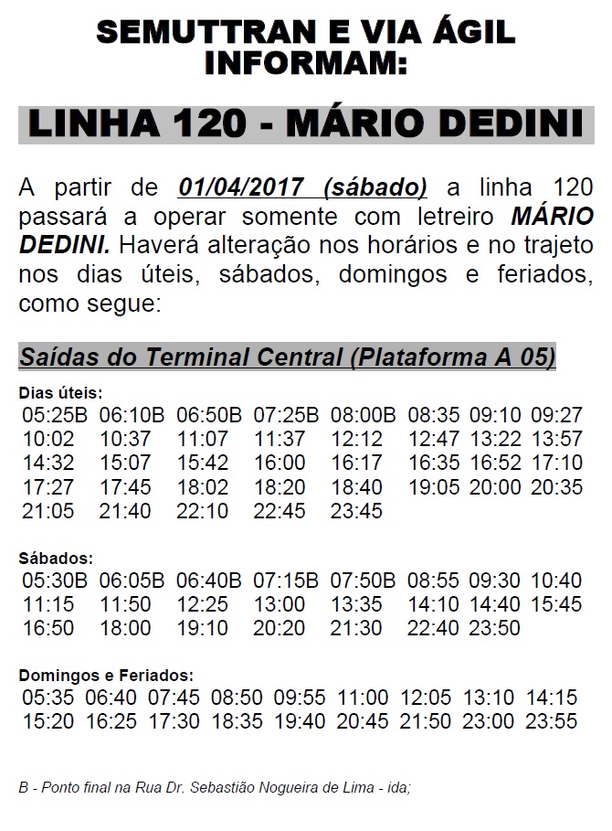 A partir do dia 01 de abril, sábado, a linha 120 – Mário Dedini passa a operar com trajeto diferenciado, que atenderá a solicitação da população dos bairros Vila Industrial e Mário Dedini.