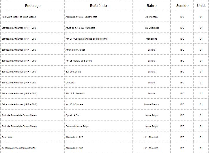 Desde janeiro/2018, já foram implantados 75 abrigos. O trabalho vem sendo realizado no município, com o intuito de oferecer mais conforto aos usuários das áreas urbana e rural. O modelo foi projetado pela Secretaria Municipal de Trânsito e Transportes, a partir de avaliação técnica considerando dimensões das calçadas e circulação de pedestres.