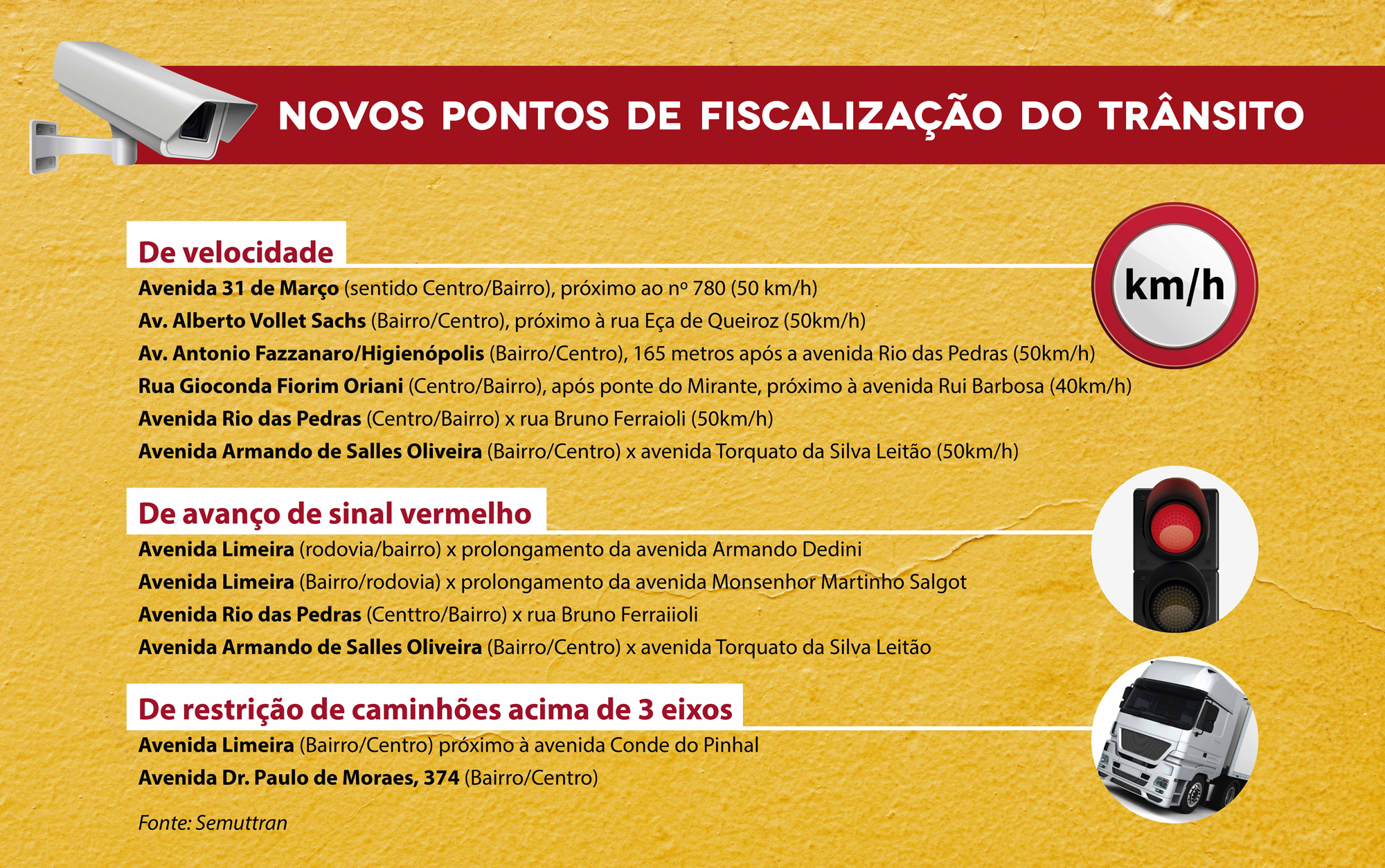 A partir de quinta, 14/11, começam a operar 12 novos equipamentos de fiscalização eletrônica de trânsito em Piracicaba. Eles medem velocidade, avanço de sinal vermelho e restrição à circulação de caminhões acima de 3 eixos. A autuação também começa na quinta-feira. Os novos locais foram escolhidos após estudo da Secretaria Municipal de Trânsito e Transportes (Semuttran), que detectou abusos de motoristas nesses locais.