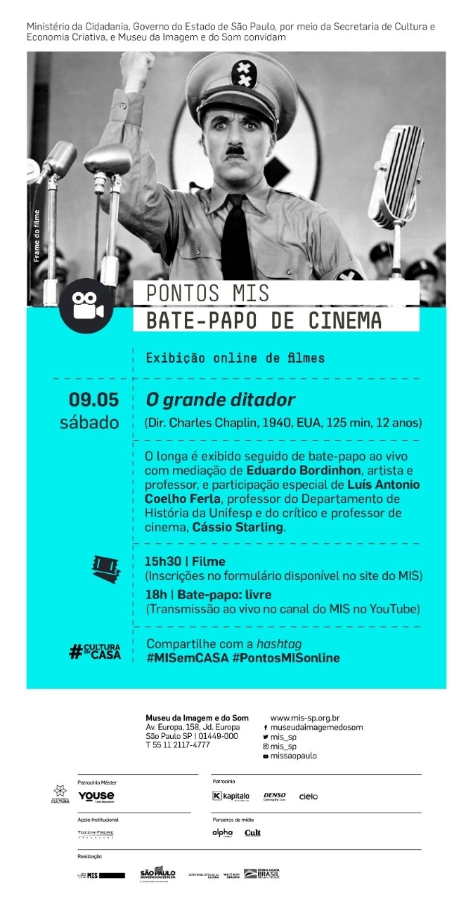 SERVIÇO – Bate-papo de cinema Pontos MIS – O grande ditador. Sábado, 09 de maio. Exibição às 15h30 (mediante inscrição no link). Bate-papo às 18h.