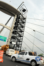 A Secretaria Municipal de Obras prossegue com os trabalhos para a instalação do elevador panorâmico, na nova ponte do Mirante. São montadas as estruturas para receber o equipamento, além do guarda-corpo da escada de emergência. De acordo com a pasta, 80% dessa estrutura já está feita.