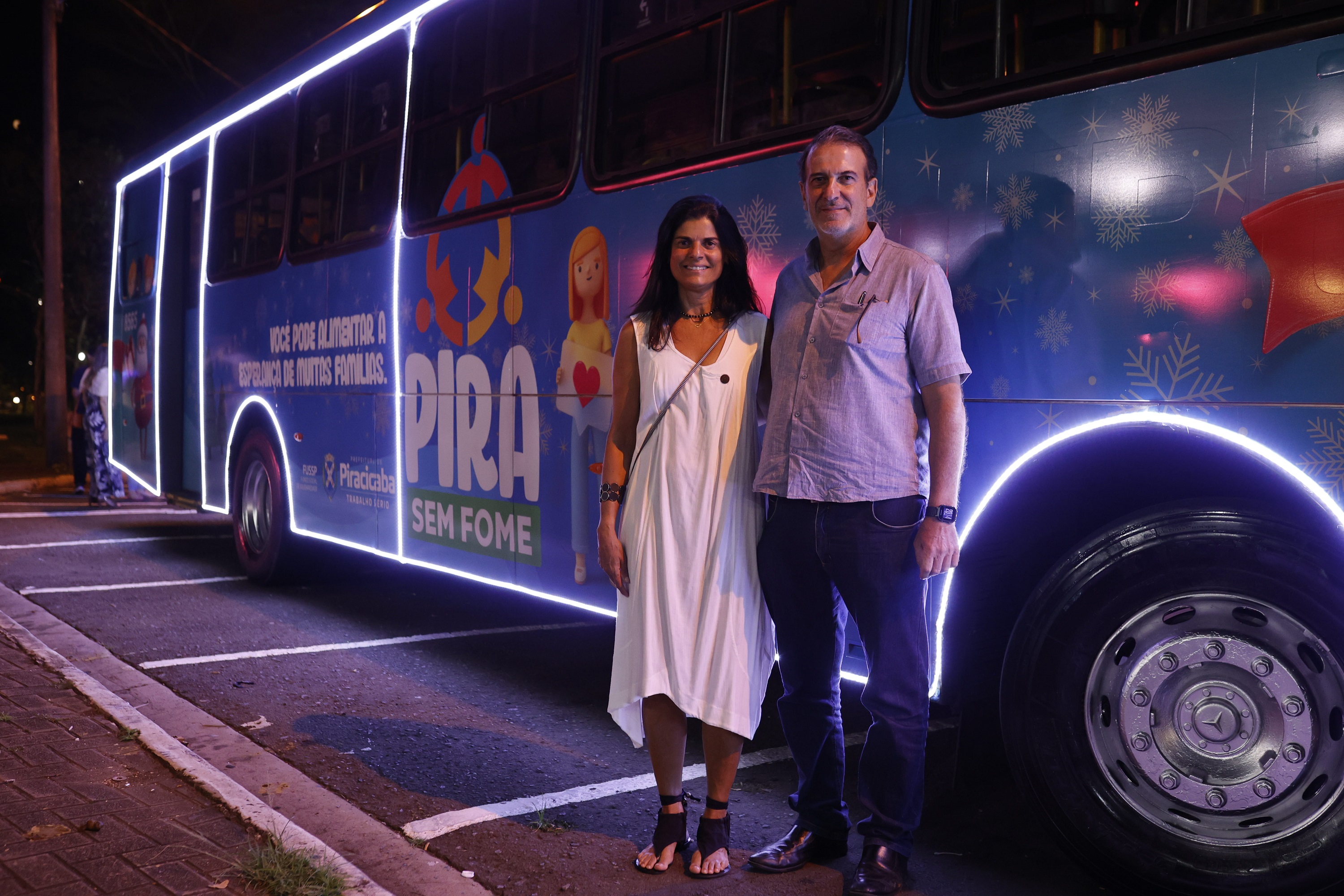 O prefeito Luciano Almeida e primeira-dama, presidente do Fussp, Andréa Almeida com o ônibus iluminado do projeto Pira Sem Fome A Prefeitura de Piracicaba, por meio do Fundo Social de Solidariedade (Fussp), realizou ontem, 14/12, o lançamento do ônibus iluminado do Pira Sem Fome, celebrando os quatro primeiros meses do projeto, que foi lançado em agosto. A ação, que integra a programação do Natal Luz & Arte, aconteceu ao lado do Casarão do Turismo e contou ainda com a apresentação do Show Casa de Noel; Papai Noel e Mamãe Noel chegaram ao evento no ônibus iluminado.