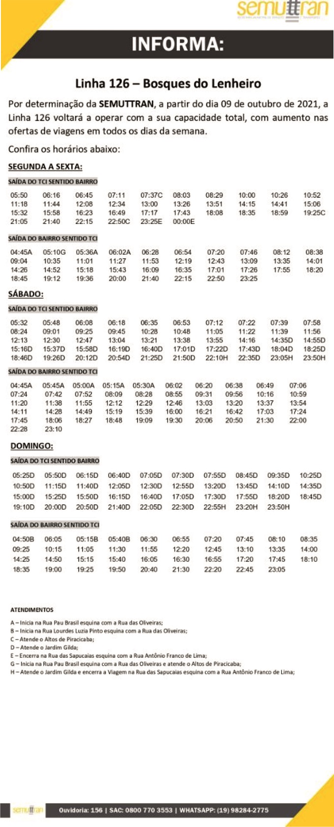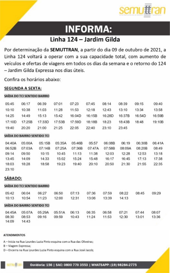 Por determinação da Secretaria de Mobilidade Urbana, Trânsito e Transportes (Semuttran), a partir de sábado, 09/10, as linhas 124-Jardim Gilda e 126-Bosques do Lenheiro, voltarão a operar com sua capacidade total, com aumento de veículos e ofertas de viagens, em todos os dias da semana. E o retorno do Jardim Gilda Expressa nos dias úteis.