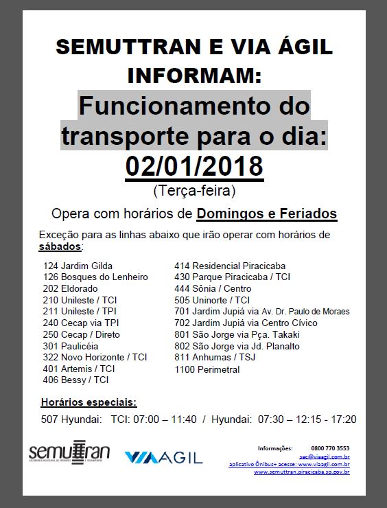 A Semuttran e Via Ágil informam os horários de atendimento do transporte público durante os dias 01 e 02 de janeiro/2018.