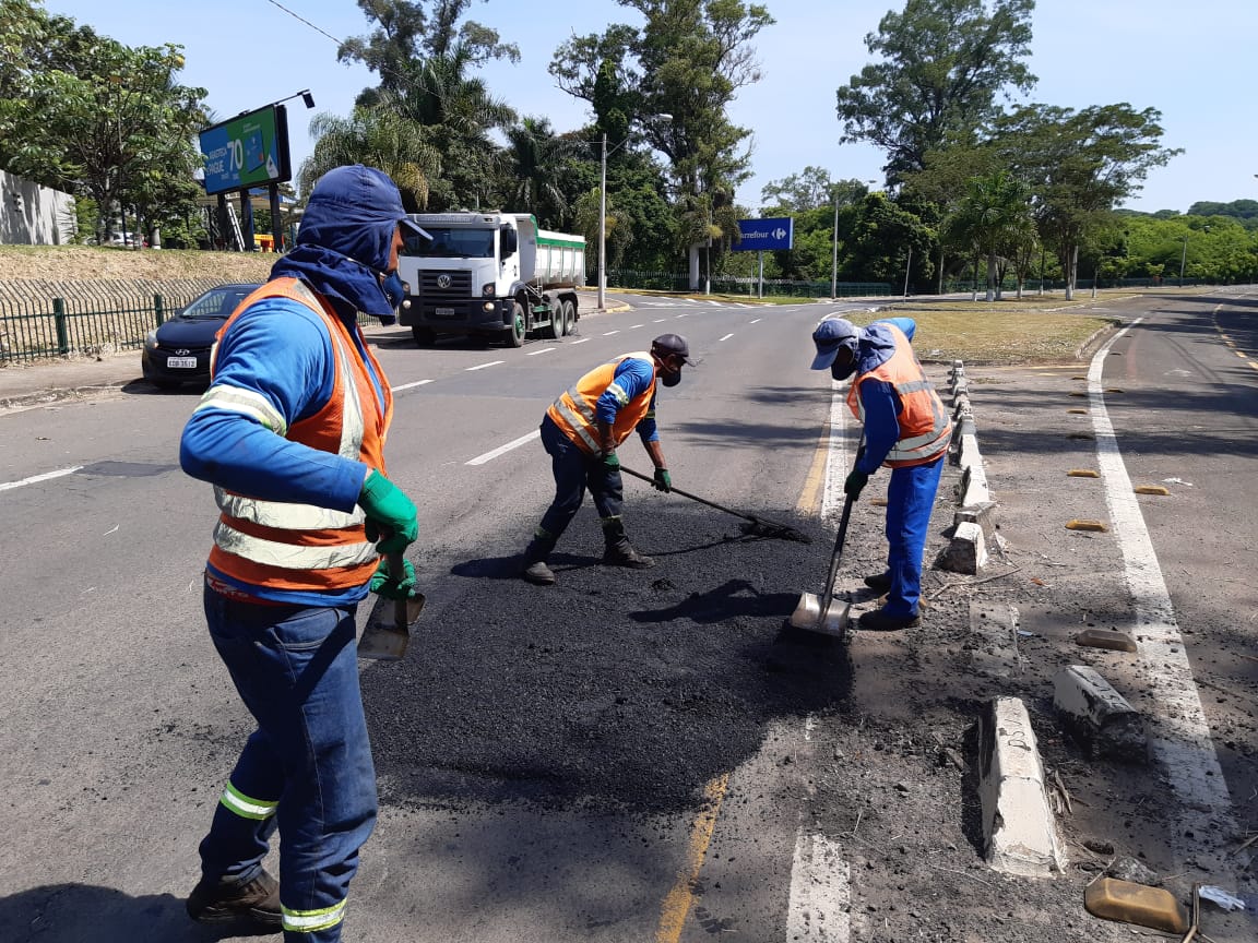 Equipe da operação Tapa Buraco na avenida Pio Sbrissa