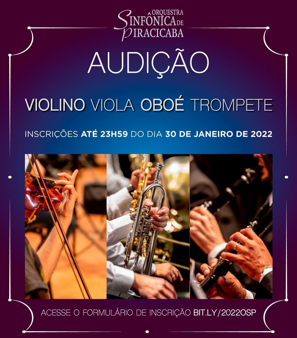 A OSP (Orquestra Sinfônica de Piracicaba) promove audição pública para preenchimento de seis vagas, uma para 2º trompete, outra para 2º oboé e corne inglês, uma para viola e outras três para violino. A inscrição deve ser feita pelo link bit.ly/2022osp até o dia 30/01.