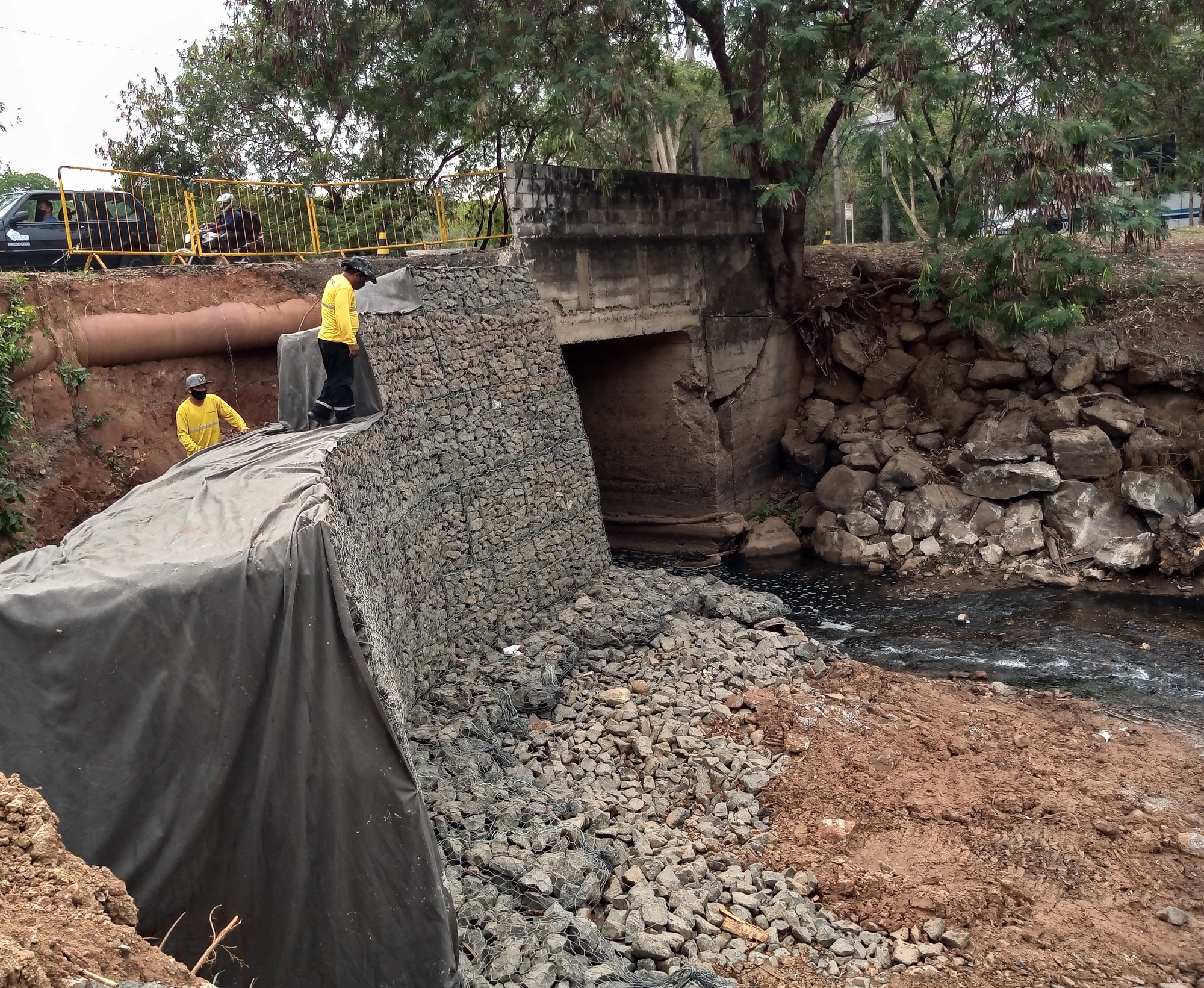 Gabião para contenção de margem do córrego do Enxofre, na Jaime Pereira, já foi montado: mais uma obra em andamento