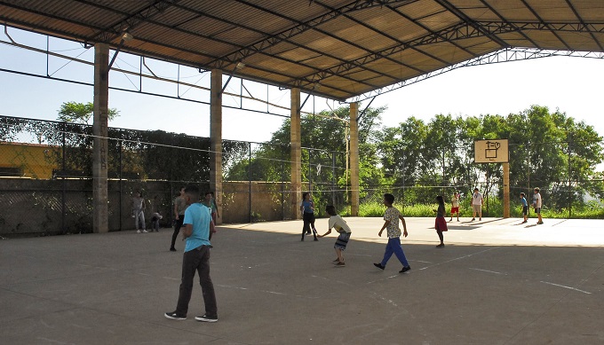 Alunos praticam atividades na quadra poliesportiva da EM Geraldo Bernardino, que receberá melhorias