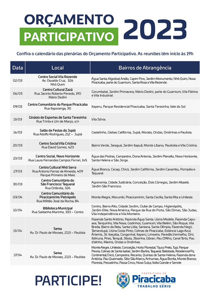 A Prefeitura, por meio da Secretaria Municipal de Governo, em conjunto com o Conselho Municipal do Orçamento Participativo (Comop), definiu as datas e locais das plenárias do Orçamento Participativo 2023. No total serão realizadas 13 encontros, sendo nove no mês de março e quatro no mês de abril, abrangendo todas as regiões da cidade. A […]