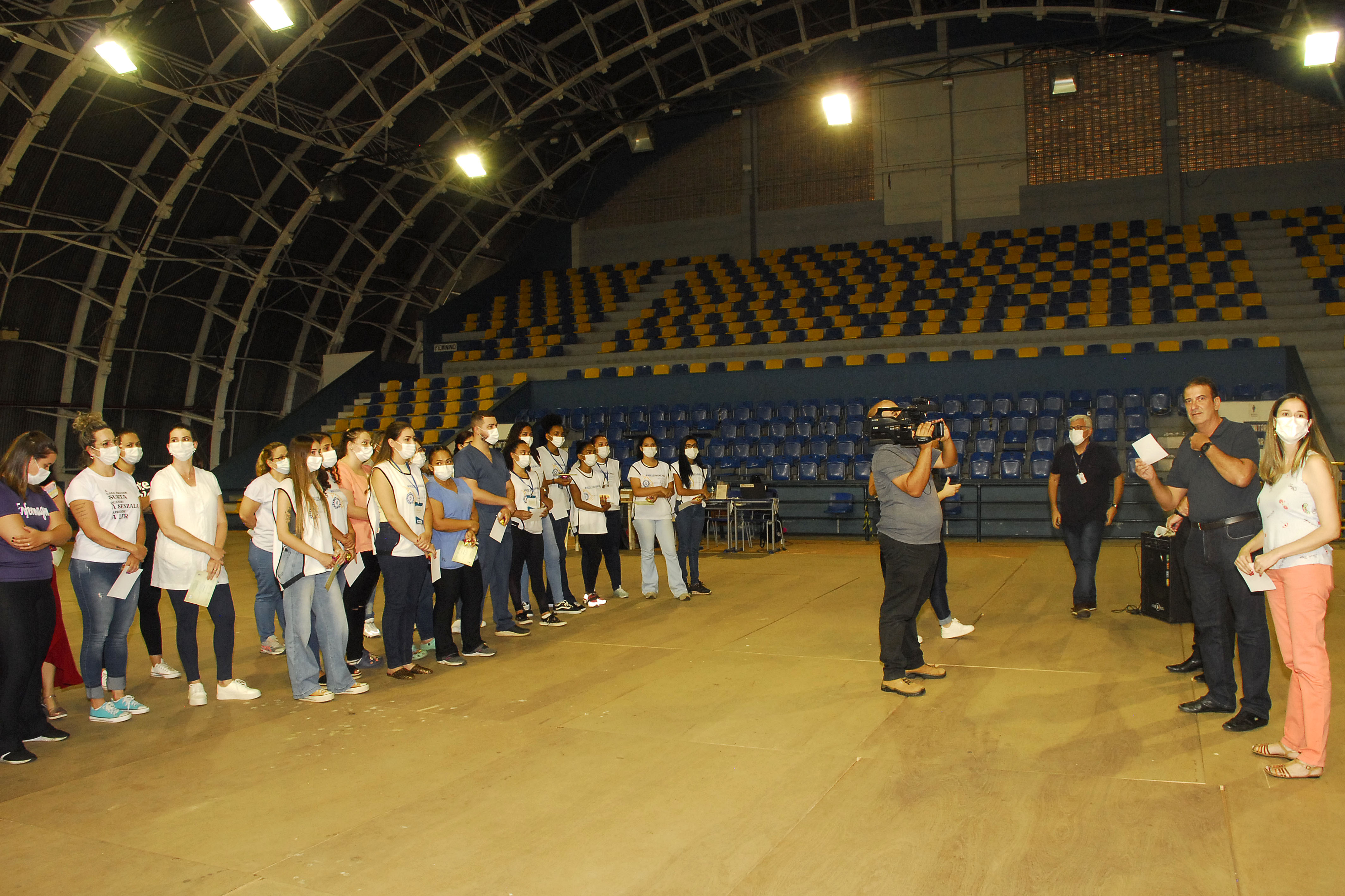 Para marcar o fim de um ciclo importante na vacinação contra Covid-19, o prefeito Luciano Almeida, o secretário de Saúde, Filemon Silvano, e o coordenador de Vigilância em Saúde, Moisés Taglietta, participaram de encontro simbólico no Ginásio Municipal de Esportes, quando agradeceram a dedicação e o empenho de cada profissional que atuou na aplicação da vacina no Ginásio. Também fizeram a entrega de um certificado a cada um. Aproximadamente 85 profissionais atuaram na vacinação no local, entre funcionários da Saúde municipal e contratados pelo Grupo +Unidos, pelo projeto #AceleraVacina, em parceria com a Fundação Caterpillar.