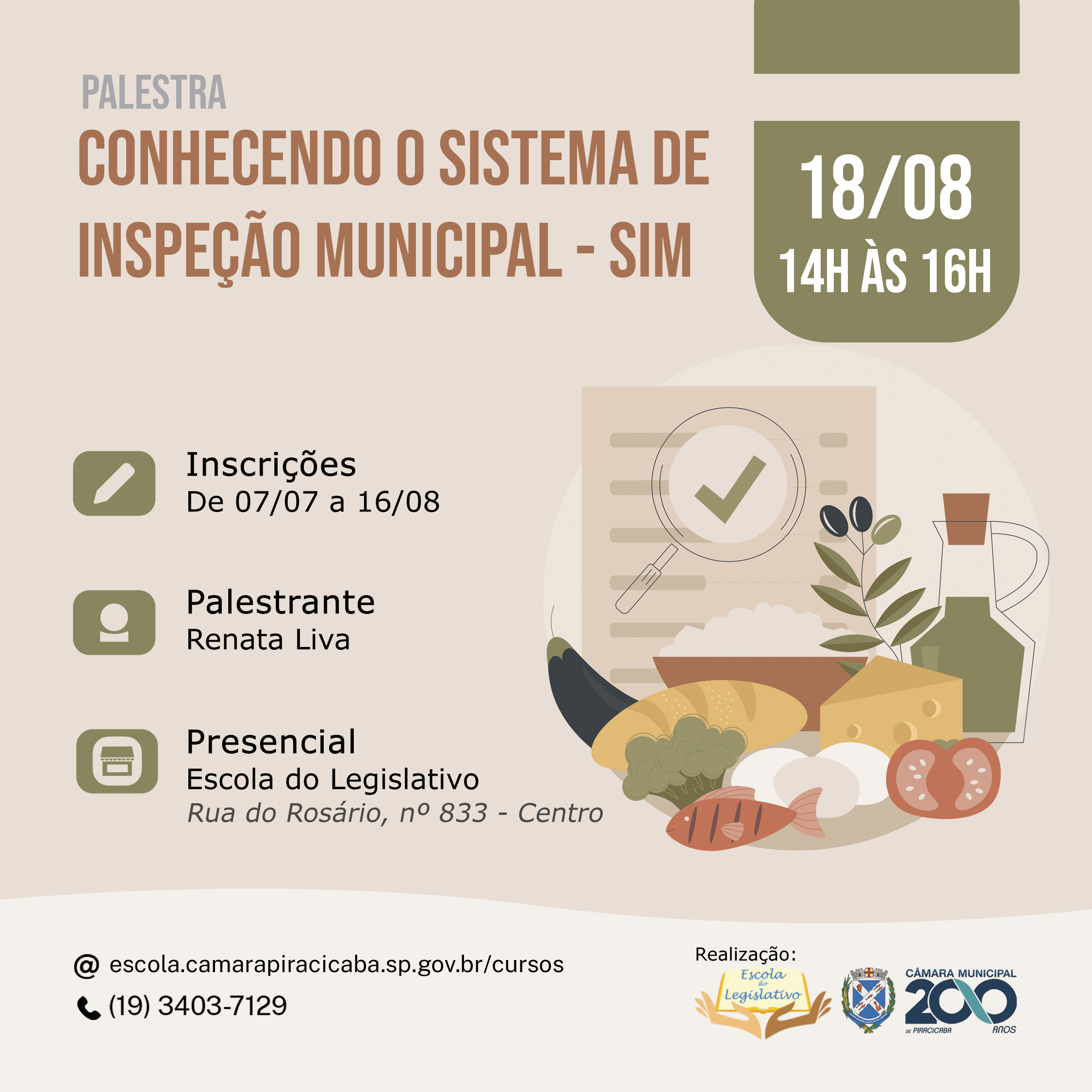 O SIM (Serviço de Inspeção Municipal), oferecido pela Prefeitura de Piracicaba, por meio da Sema (Secretaria Municipal de Agricultura e Abastecimento), será apresentado em palestra nesta quinta-feira, 18/08, a partir das 14h, na Escola do Legislativo da Câmara Municipal de Piracicaba.