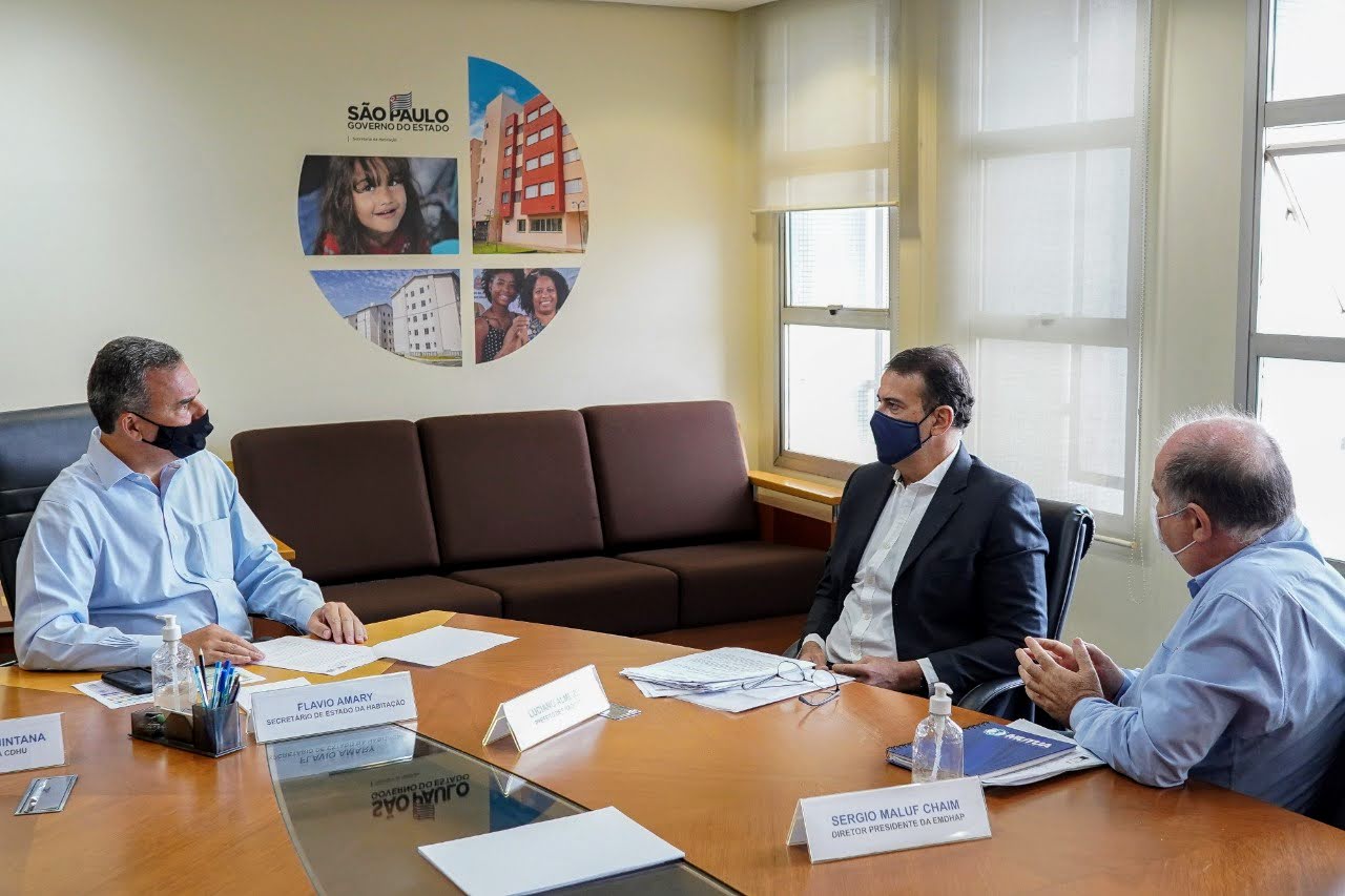 Flávio Amary, secretário estadual da Habitação, o prefeito Luciano Almeida e Sérgio Chaim, da Emdhap