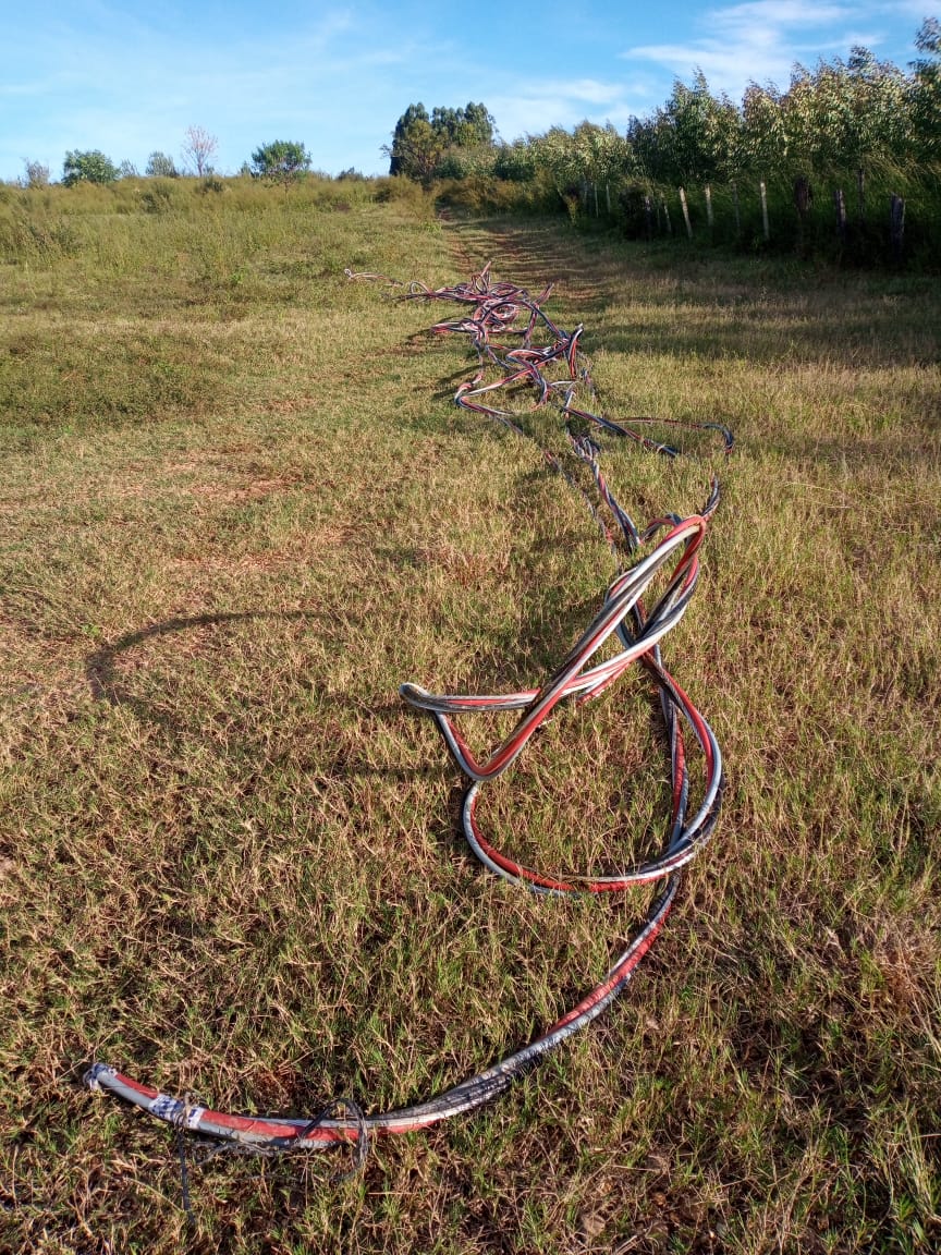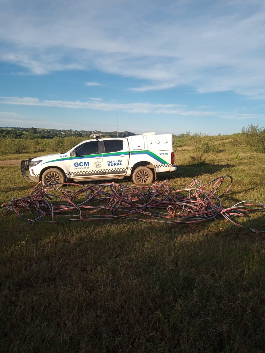 A Patrulha Rural, da Guarda Civil, encontrou ontem, 19/04, cerca de 200 metros de cabos elétricos pesando cerca de 300 quilos, abandonados num pasto no bairro dos Dini, na região de Artemis. Foi necessária a utilização de trator e caminhão para a remoção do material do local. Até a elaboração do Boletim de Ocorrência o dono do material não havia sido localizado e nem o material tinha sido reclamado por alguém. Carga vale cerca de R$ 20 mil.