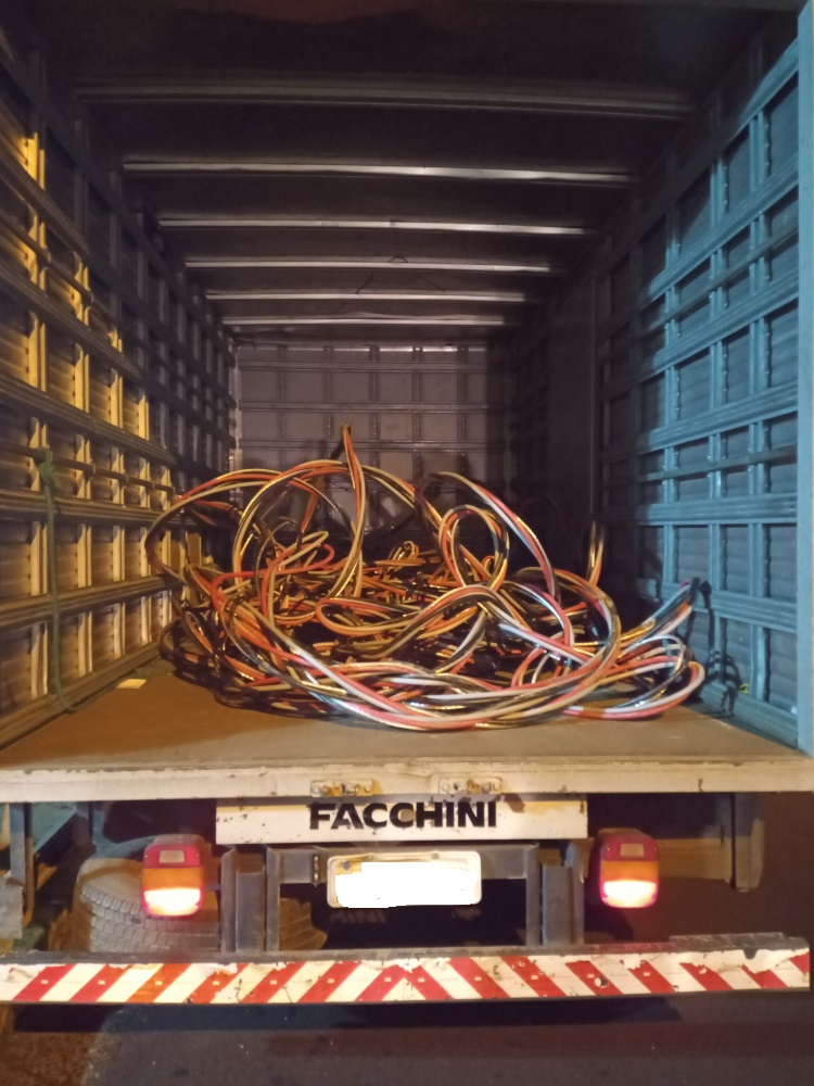 Fiação acondicionada no caminhão que transportou o material até o Plantão Policial