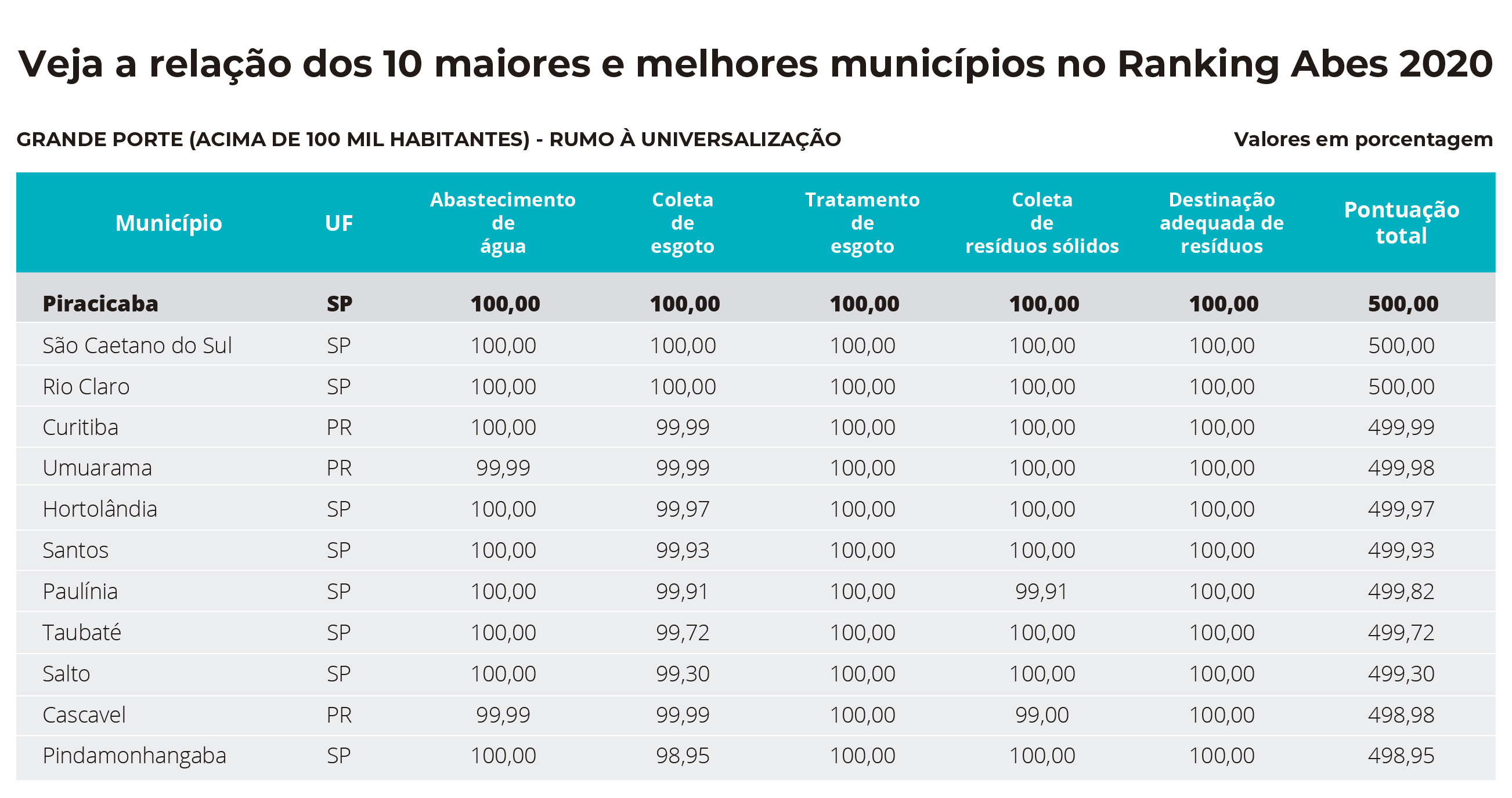 Os municípios são divididos em duas faixas populacionais: pequeno e médio porte (até 100 mil habitantes) e grande porte (acima de 100 mil), o que torna a comparação mais equilibrada. Entre os 1.857 municípios, 40 são de grande porte, classificados como Rumo à Universalização – onde Piracicaba se encaixa – com pontuação superior a 489 e total de 500 pontos. Piracicaba alcançou 500 pontos em 2017; em 2018 (ao lado de São Caetano do Sul); em 2019 (com Rio Claro e São Caetano do Sul) e agora, em 2020 (com Rio Claro e São Caetano do Sul).