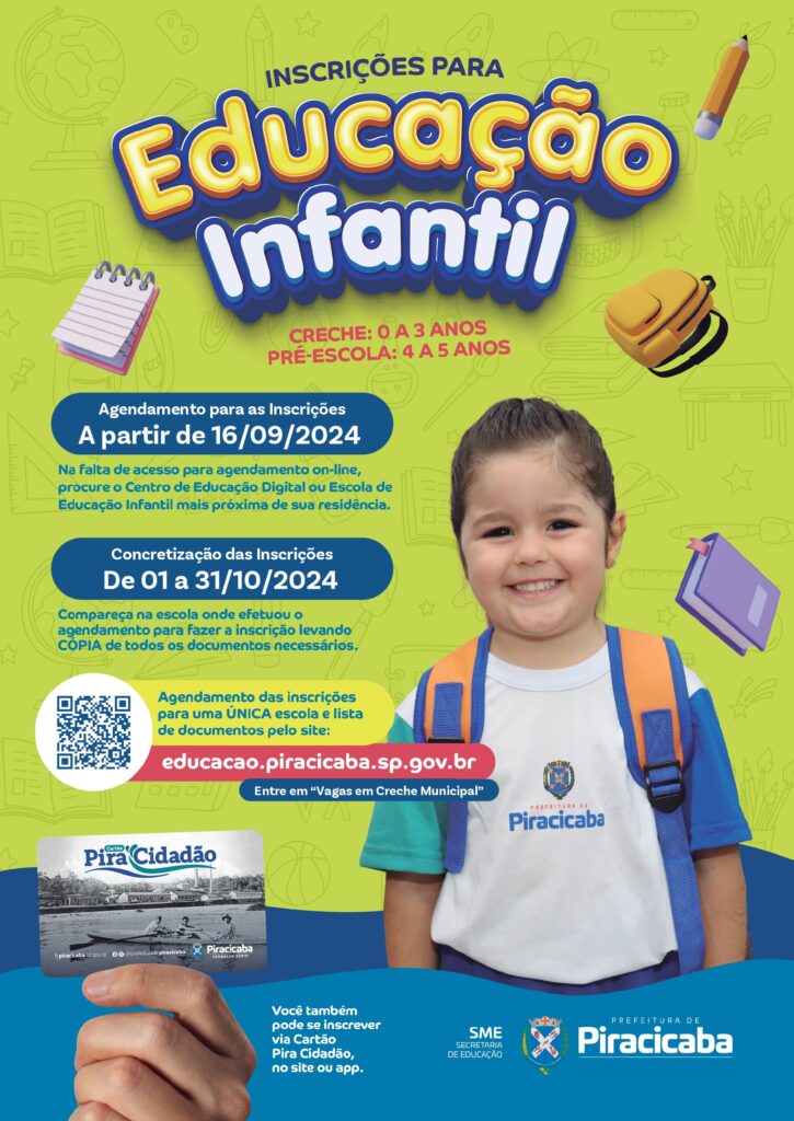O agendamento das inscrições pode ser realizado de forma digital por meio do site da Secretaria Municipal de Educação – educacao.piracicaba.sp.gov.br– entrando no campo Vagas em Creche Municipal. Na falta de acesso para agendamento online, os interessados devem procurar um Centro de Educação Digital ou a escola de educação infantil mais próxima de sua residência.
