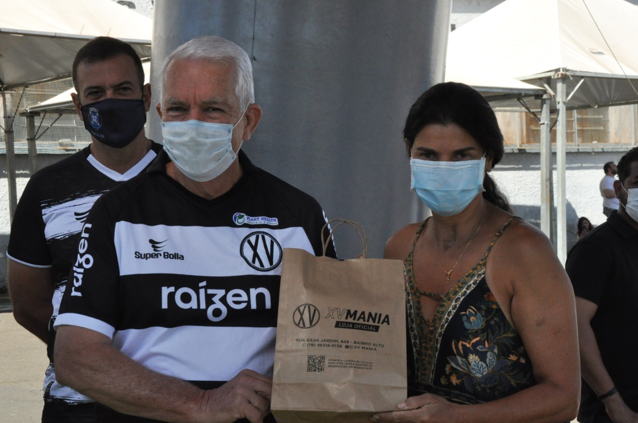 Presidente do XV, Rodolfo Geraldi presenteou Andréa Almeida com uma camiseta do Clube