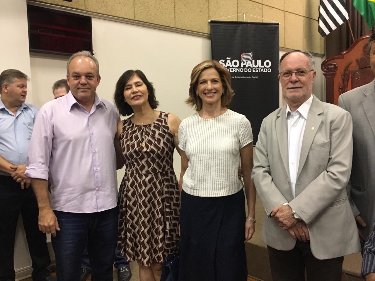 O presidente da Câmara de Vereadores, Gilmar Rotta, Eliete Nunes, secretária da Smads, Célia Parnes e o prefeito Barjas Negri