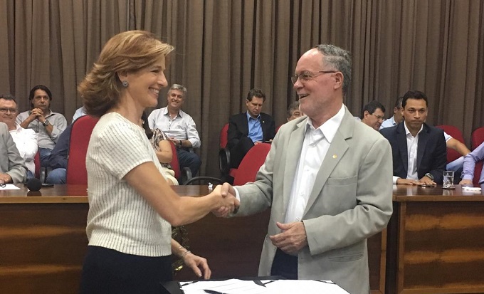 Célia Parnes e o Prefeito Barjas Negri, durante o ato de assinatura