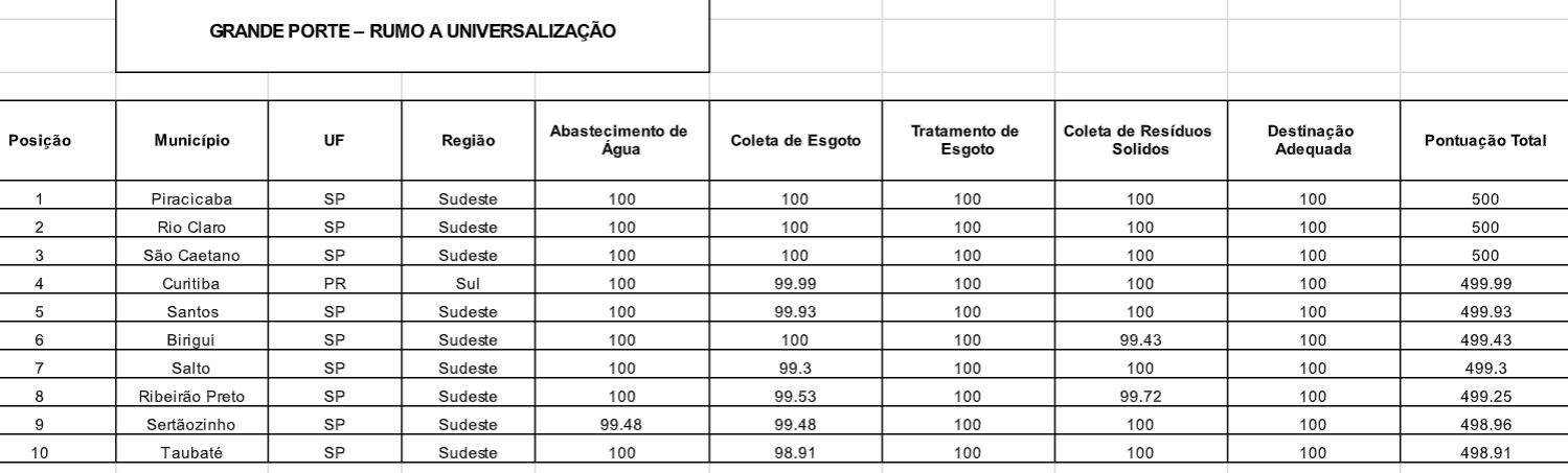 Os municípios, segundo a ABES, apresentaram suas informações para o cálculo dos indicadores que compõem o ranking, sendo classificados em quatro categorias, conforme a pontuação total obtida pela soma do desempenho de cada indicador. A pontuação máxima possível é de 500 pontos, atingida quando o município alcança 100% em todos os cinco indicadores, como foi o caso de Piracicaba. As categorias são: Rumo à universalização – acima de 489; Compromisso com a universalização – de 450 – 489; Empenho para a universalização – de 200 – 449 e Primeiros passos para a universalização – abaixo de 200.