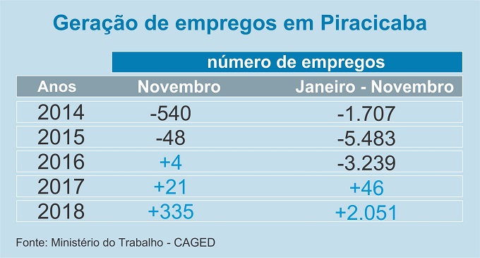 O Caged (Cadastro Geral de Empregados e Desempregados), órgão do Ministério do Trabalho, registrou a criação de 2.051 novas vagas de emprego em Piracicaba em 2018. Somente no mês de novembro foram gerados 335 novos postos, 46 a mais que no mês de outubro, que ficou em 289. Os números mostram a tendência de crescimento dos empregos formais no município.