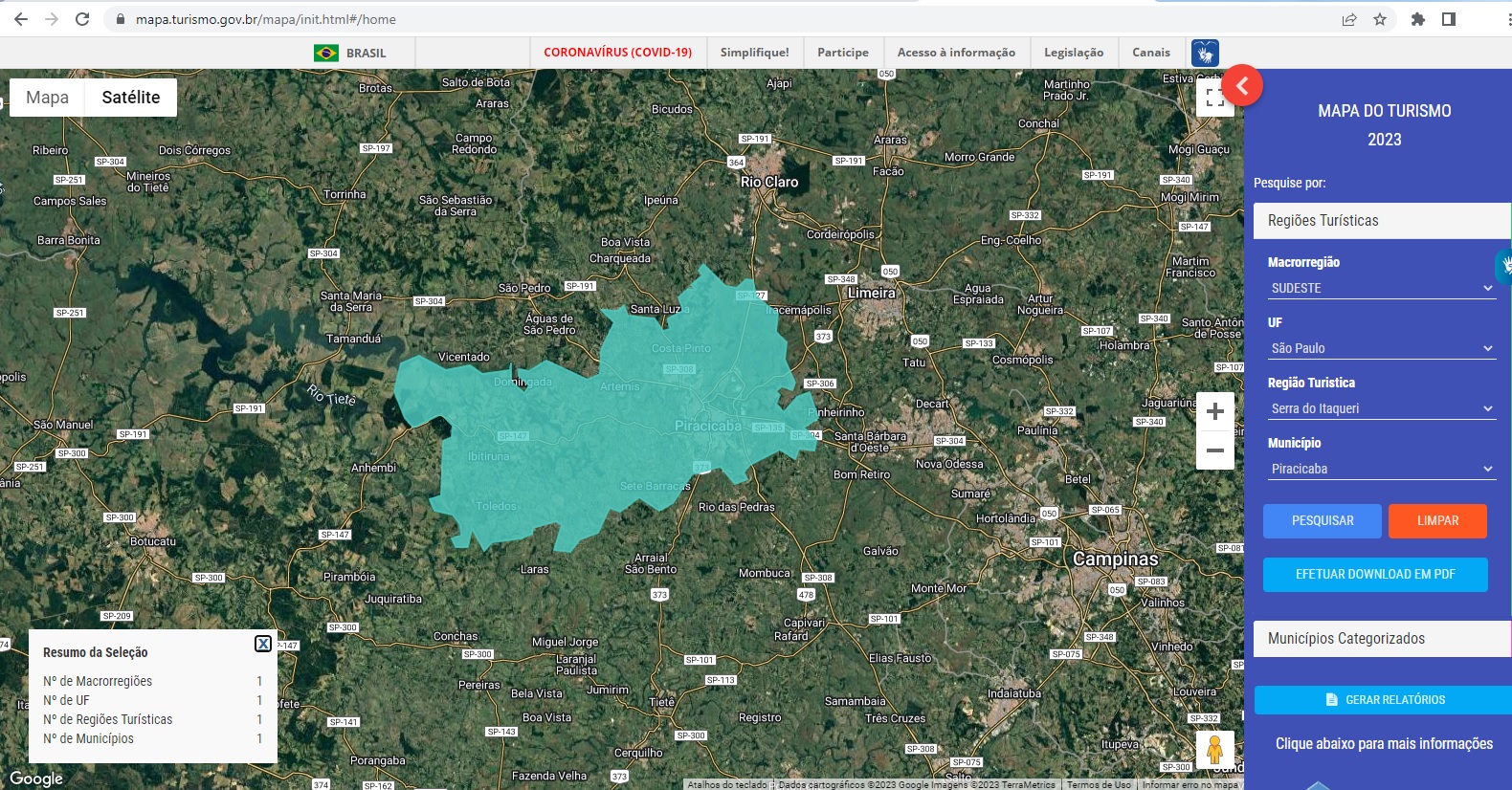 Piracicaba integra oficialmente o Sismapa (Sistema de Informações do Mapa do Turismo Brasileiro) 2023, instrumento do Programa de Regionalização do Turismo que define a área territorial a ser trabalhada prioritariamente pelo Governo Federal para o desenvolvimento de políticas públicas. Na semana passada, a Prefeitura noticiou que a cidade havia sido aprovada pelo Governo do Estado para renovar a participação no Sistema. Agora, houve a validação por parte do Ministério do Turismo e o sistema com os dados referentes ao município já estão disponíveis no Mapa, que pode ser acessado gratuitamente em mapa.turismo.gov.br/mapa/init.html#/home.