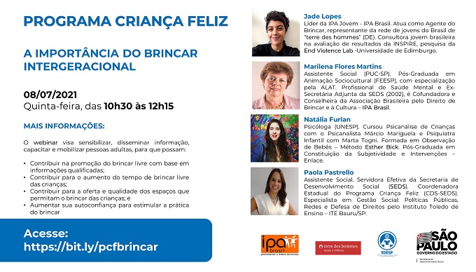 Na próxima quinta-feira, 8/07, o Programa Criança Feliz de Piracicaba será representado pela psicóloga Natália Furlan em webinar promovido pela Secretaria de Desenvolvimento Social (SEDS) e Escola de Desenvolvimento Social do Estado de São Paulo (EDESP). O encontro online com o tema A Importância do Brincar Intergeracional acontece na quinta, 08/07, às 10h30, transmitido ao vivo pelo Canal EDESP YouTube.