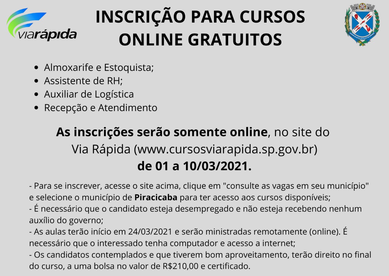 Com o objetivo de preparar profissionalmente o cidadão para que ele possa aprimorar suas habilidades e atender as demandas do mercado, a Prefeitura de Piracicaba, por meio da Secretaria Municipal de Desenvolvimento Econômico, Trabalho e Turismo (Semdettur), em parceria com a Secretaria de Desenvolvimento Econômico, Ciência, Tecnologia e Inovação do Estado de São Paulo, recebe 4 turmas de cursos online gratuitos do Programa Via Rápida.