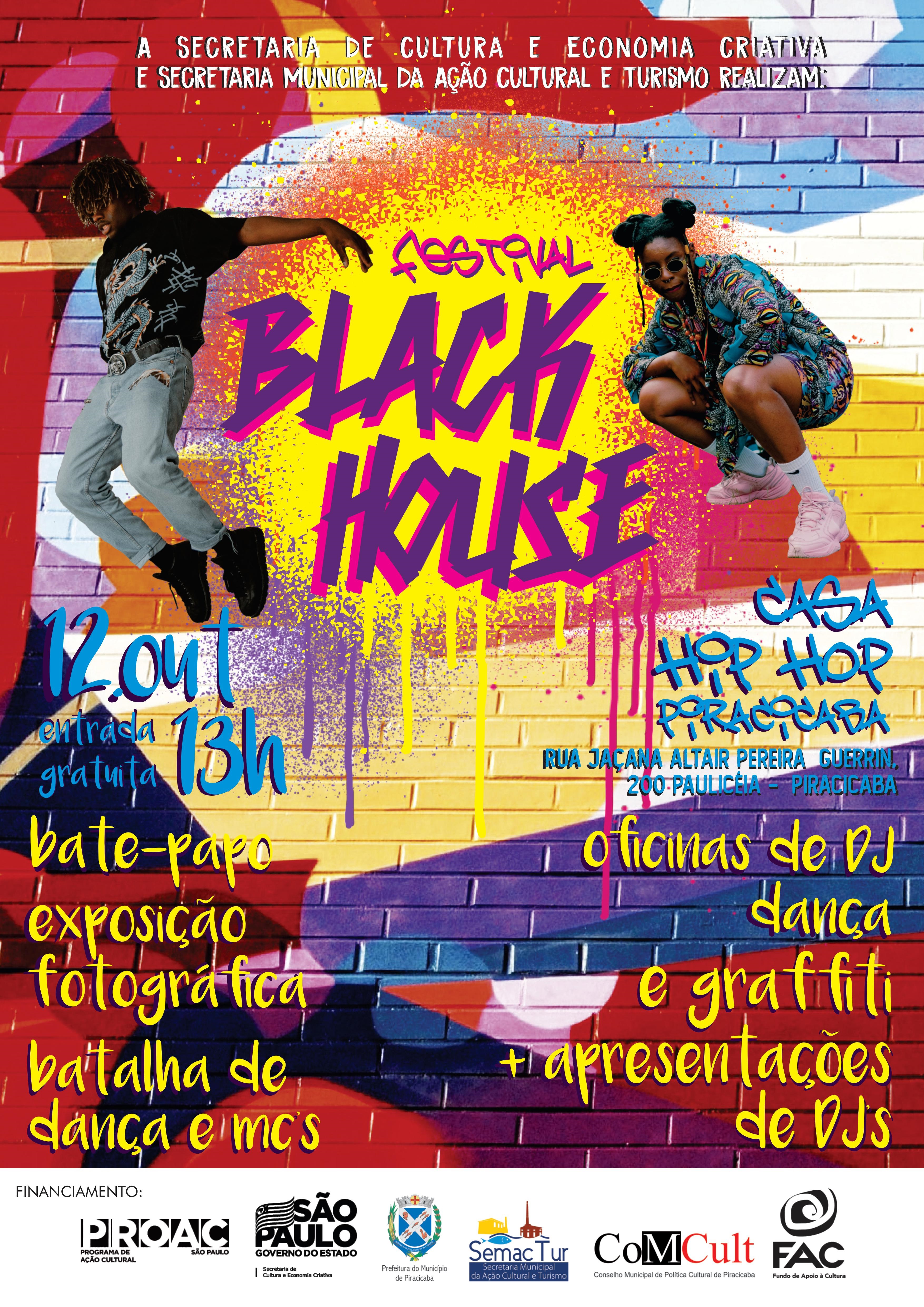 O festival Black House está chegando! No dia 12 de outubro, a Casa do Hip Hop de Piracicaba será palco de uma grande reunião da cultura hip hop e programação com DJs, oficinas, batalha de MCs, concurso, desfiles, exposições e palestras. A realização é da Secretaria de Cultura e Economia Criativa do Estado de São Paulo e Secretaria da Ação Cultural e Turismo (SemacTur), por meio de recursos do ProAC Municípios 2019, Fundo de Apoio à Cultura e Conselho Municipal de Política Cultural (ComCult). O evento gratuito, acontece das 13h às 22h para jovens e adolescentes.