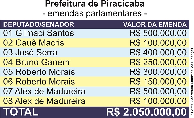 Piracicaba receberá mais R$ 2,050 milhões em emendas parlamentares