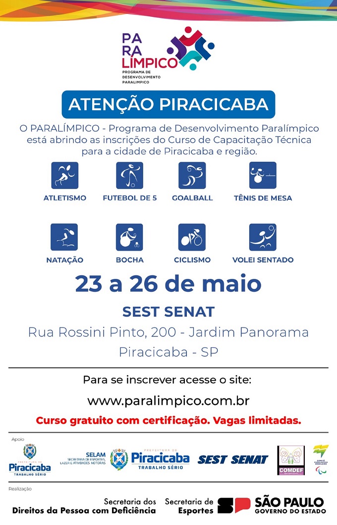 Entre os dias 23 e 26/5, das 8h30 às 17h30, Piracicaba receberá o projeto Paralímpico (Programa de Desenvolvimento Paralímpico), uma iniciativa do Governo do Estado de São Paulo, por meio das Secretarias de Estado de Esportes e dos Direitos da Pessoa com Deficiência, que visa fomentar o esporte paralímpico de base.